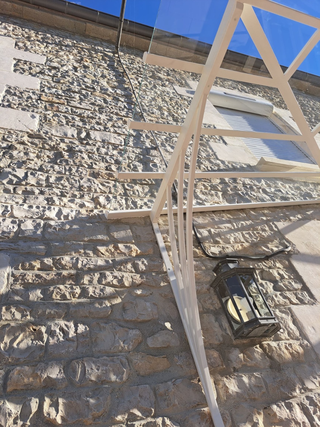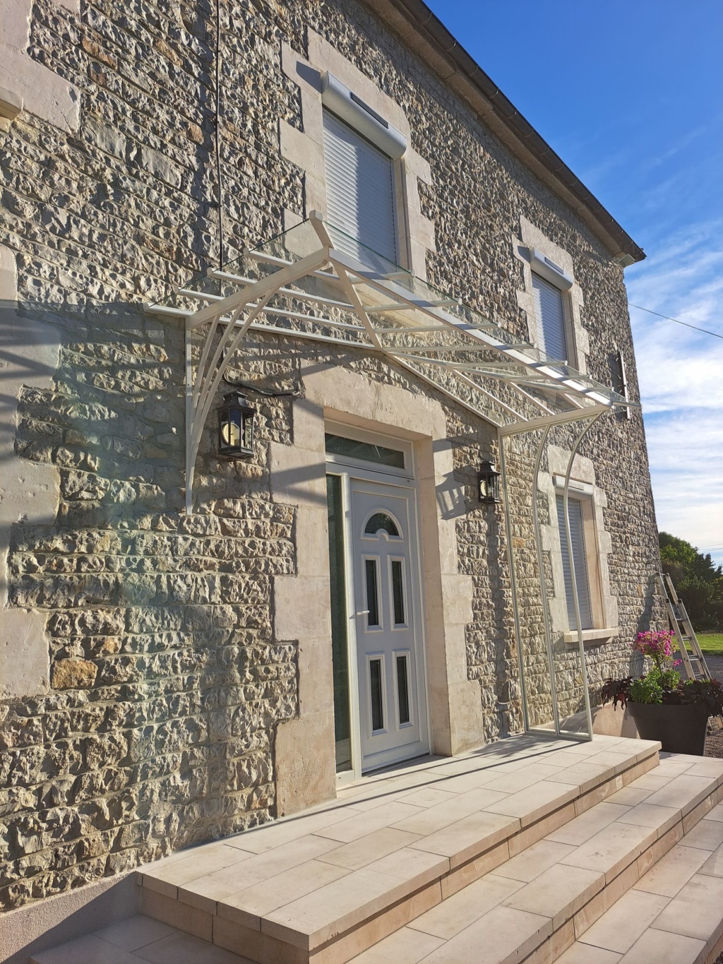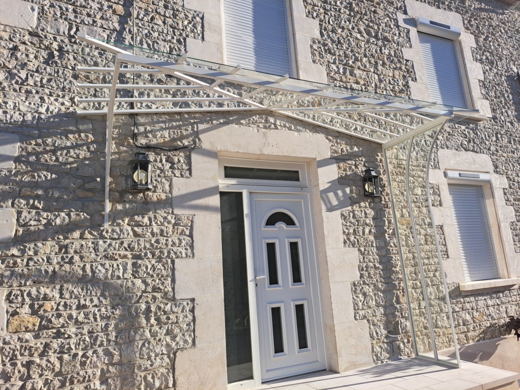 Marquise en acier thermolaqué dont le dessin est issu du besoin des client d’une protection contre la pluie pour leurs chiens du côté du vent…