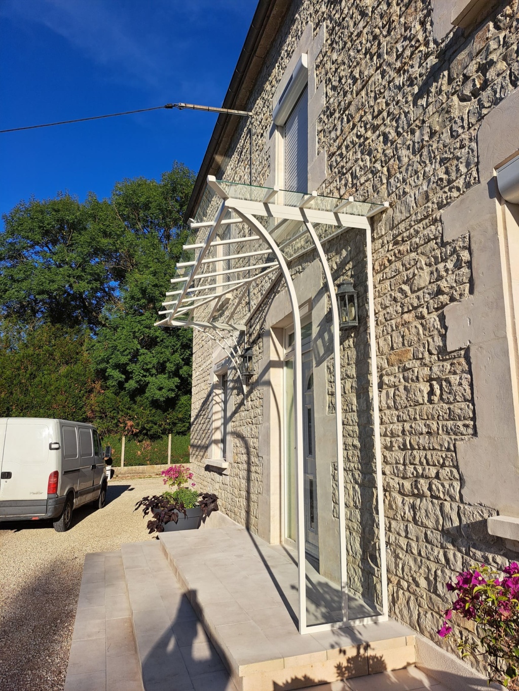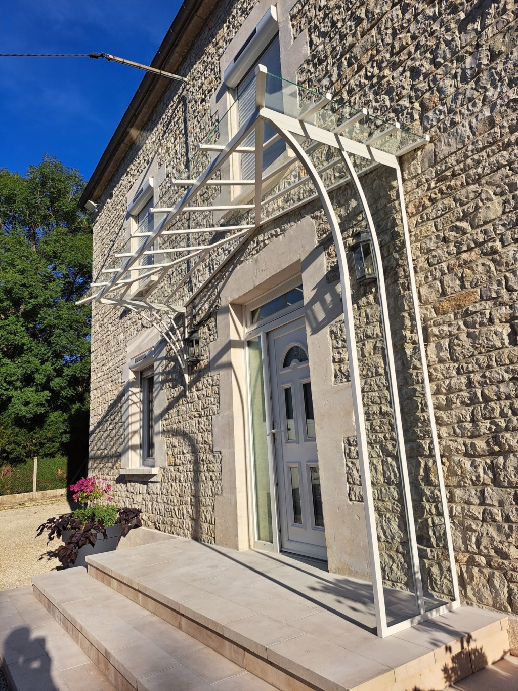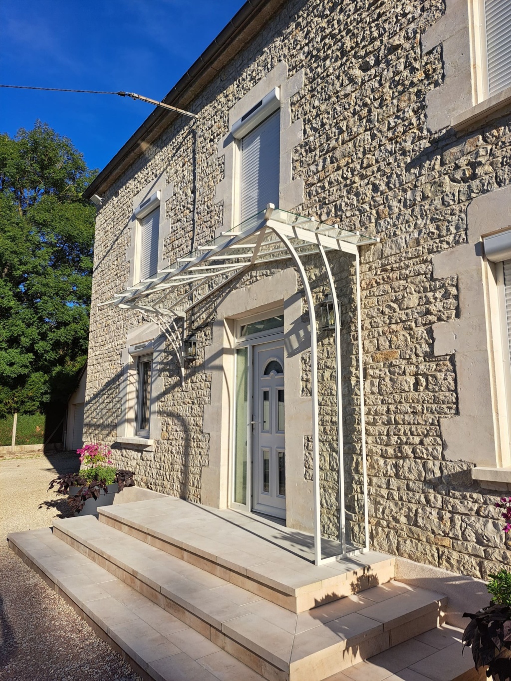 Marquise en acier thermolaqué dont le dessin est issu du besoin des client d’une protection contre la pluie pour leurs chiens du côté du vent…